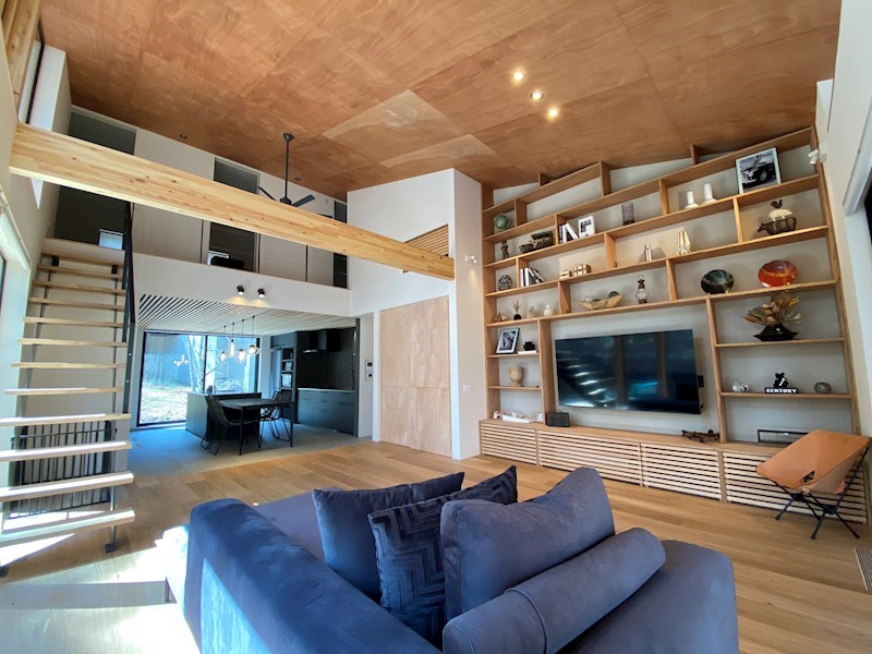 豊かな緑に包まれ、陽光が降り注ぐ、広大なデッキのある贅沢な平屋暮らし